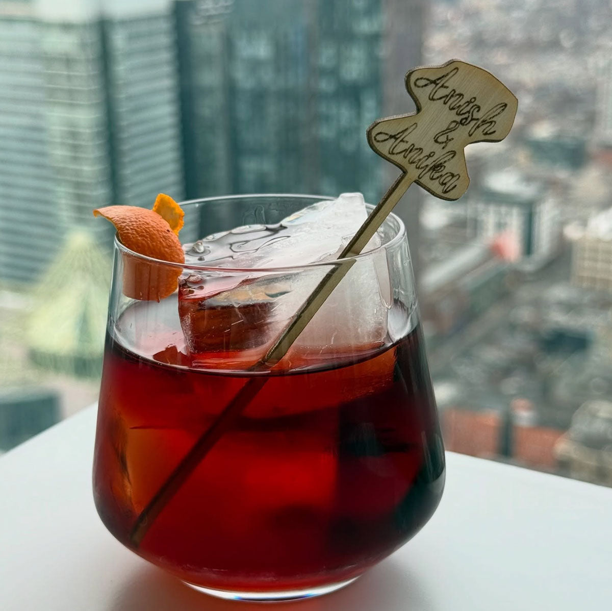The perfect pairing: Custom Stir Sticks beautifully accessorize celebratory cocktails.